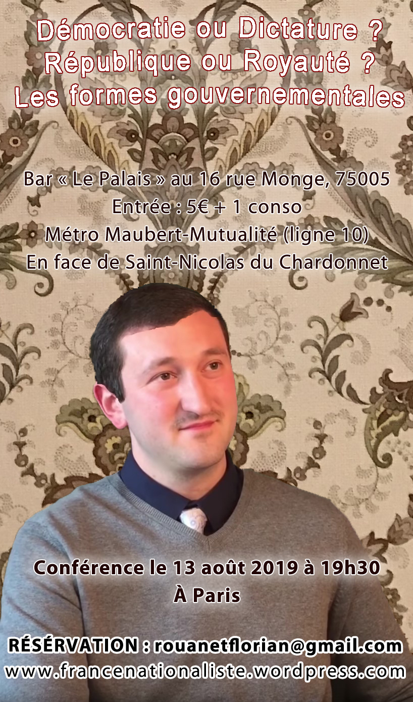 • Annonce d’une conférence à Paris « Démocratie ou dictature ? République ou royauté ? »