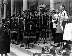 8Mais grâce à la politique philo-catholique inaugurée par le nouveau Régime, ces éléments de perplexité s’évaporèrent très vite. Pour les clérico-fascistes, le fait que le Régime montrait un visage autoritaire de plus en plus répressif et totalitaire apparaissait secondaire. Du reste, la culture politique des catholiques nationaux avait toujours été essentiellement conditionnée par une conception politique intransigeante et antidémocratique. L’approbation de Mussolini, qui aurait pu assurer de nombreux bénéfices à la cause catholique, devint ainsi de plus en plus concrète, au fur et à mesure que le fascisme redonnait à la religion le rôle public qui naturellement lui revenait dans la vie de la nation.