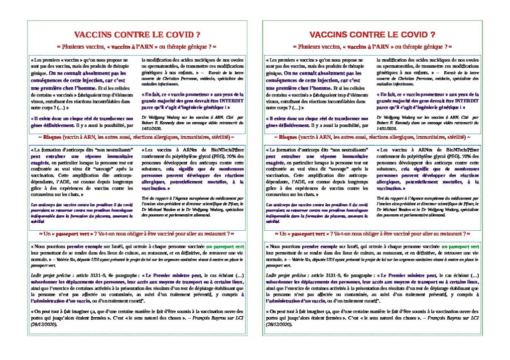 Enfin, voici un petit moyen appréciable de lutter par la réinformation : une affichette à imprimer chez soi et à balancer dans toutes les boîtes aux lettres « Du nord à la Méditerranée ; Et de l’Océan aux Pyrénées » (chant de Pierre Sidos). Tout est dedans en quelques citations émanants de certains acteurs connus (compatibles et incompatibles avec nous) : la modification de l’ADN, le passeport sanitaire, l’affairisme pharmaceutique, ladite balance bénéfices/risques, etc.