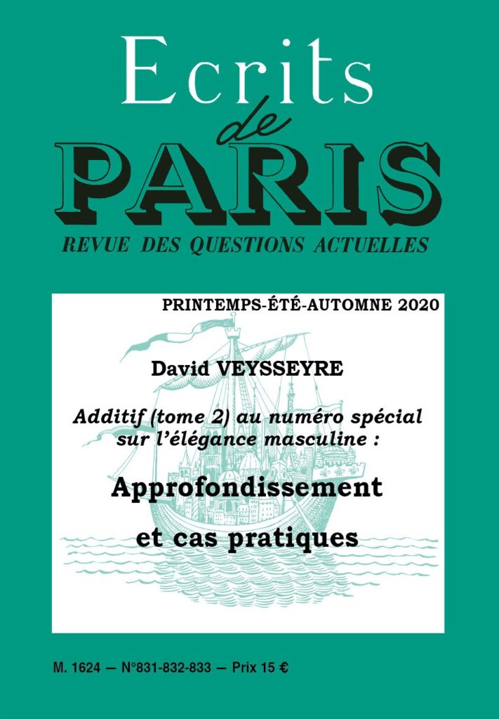 Je vous informe que l’additif que j’ai rédigé en complément au numéro spécial sur l’élégance masculine est disponible sur le site de Rivarol à Ecrits de Paris.