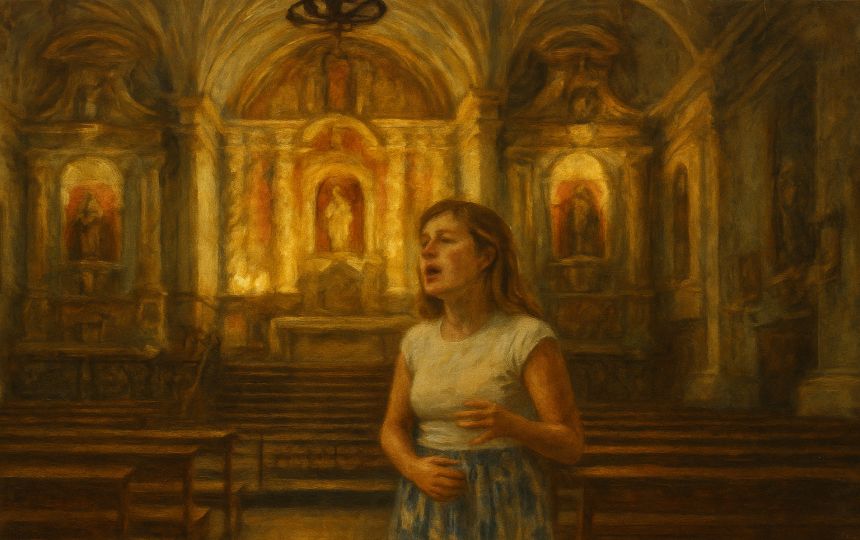 Quelle conscience sacrée permet de se parer d’un crop-top en milieu eucharistique — fut-ce certes en milieu moderniste ? Thaïs, l’ancienne « tradinette », vêtue d’un haut moulant laissant deviner sa poitrine, également son nombril, s’est livrée à un sacrilège esthétique ; elle a fait de l’église un studio. La déférence requise envers Dieu s’en est trouvée foulée, ternie, réduite à un simple élément de décor.