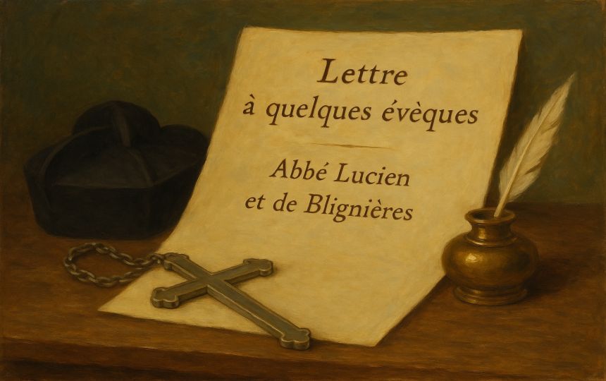 Nous voici donc sommés d’examiner la « mince mais dense » brochure des abbés Lucien et de Blignières (probablement rédigée sous la direction voire la participation fut-elle lointaine de Mgr Guérard des Lauriers, car s’il n’en fut pas le rédacteur officiel, sa « Thèse de Cassiciacum » y sert de soubassement constant) — cent vingt-sept pages brèves comme une estafilade, où ladite Lettre à quelques évêques précède ce Mémoire sur certaines erreurs actuelles : deux textes soudés en un manifeste de combat, avant de servir, paradoxe savoureux, de tremplin vers le ralliement moderniste romain… (bibliotheque.dominicains.fr)