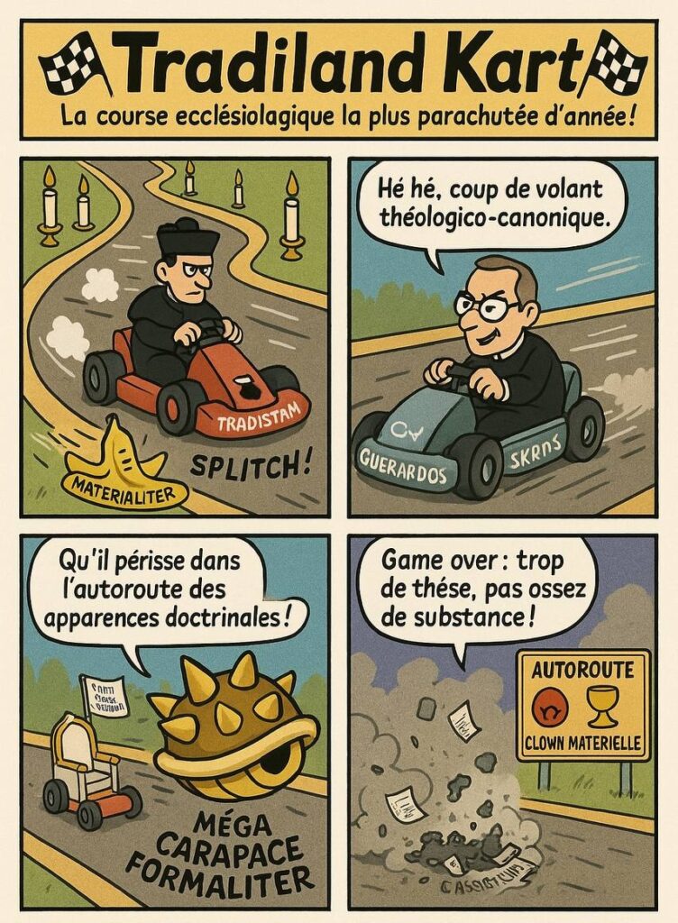 Et s’il n’y a rien à redire de leur défense de la foi contre le faux oecuménisme, par exemple, que l’on bande donc les muscles de l’intellect : l’heure est venue de dissiper le brouillard des sophismes, de distinguer le métal pur de l’alliage frelaté, d’opposer, sous la voûte de la Tradition, la sapience au fatras des opinions téméraires : l’orage théologique gronde, les gants claquent !