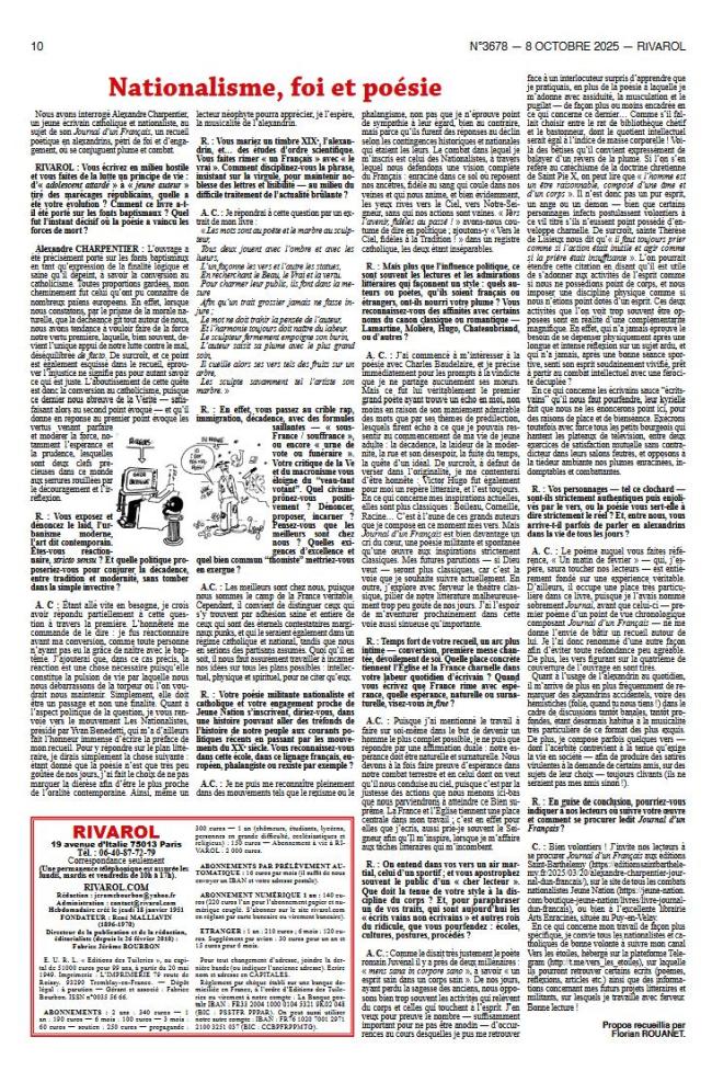 Numéro : RIVAROL n°3678, 8 octobre 2025, page 10. Titre de page : « Nationalisme, foi et poésie ».